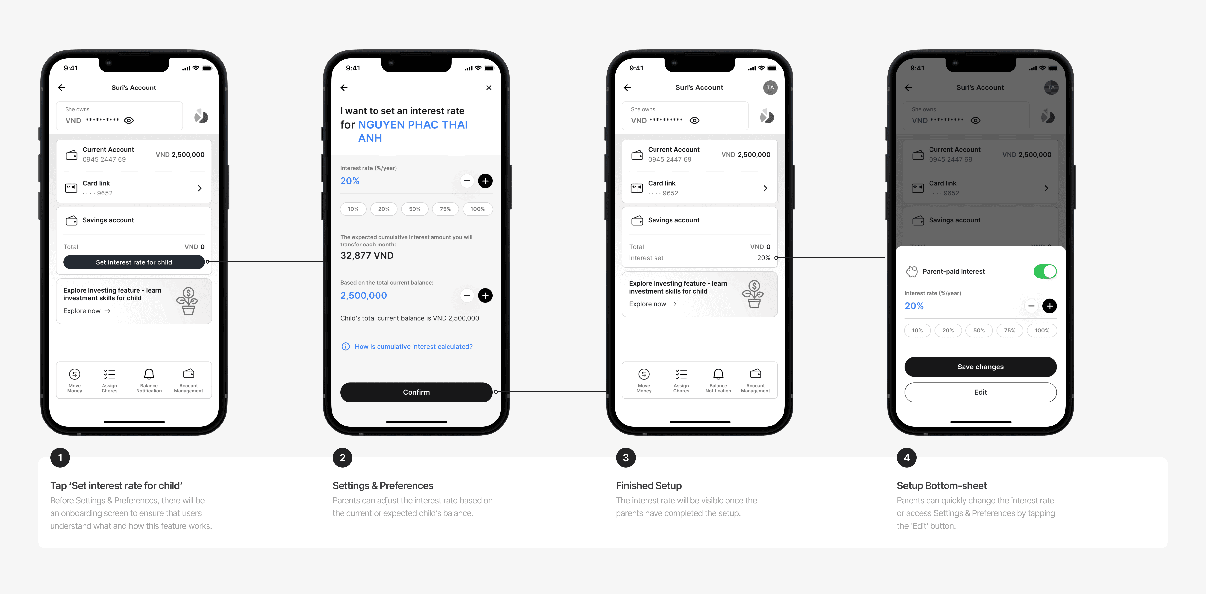 As we've mentioned the two main features, Saving and Investing but in the case study, we've only covered half of the Saving feature on the parents' app, and we haven't tackled the Investing part yet. We are still in the process of researching and designing this feature.
