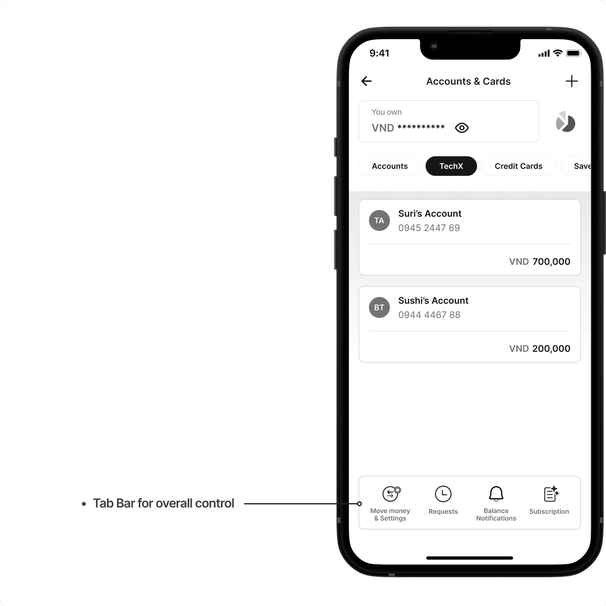 In TechX home screen in Techcombank, the tab bar acts like a center for overall control of settings that apply to all TechX accounts.