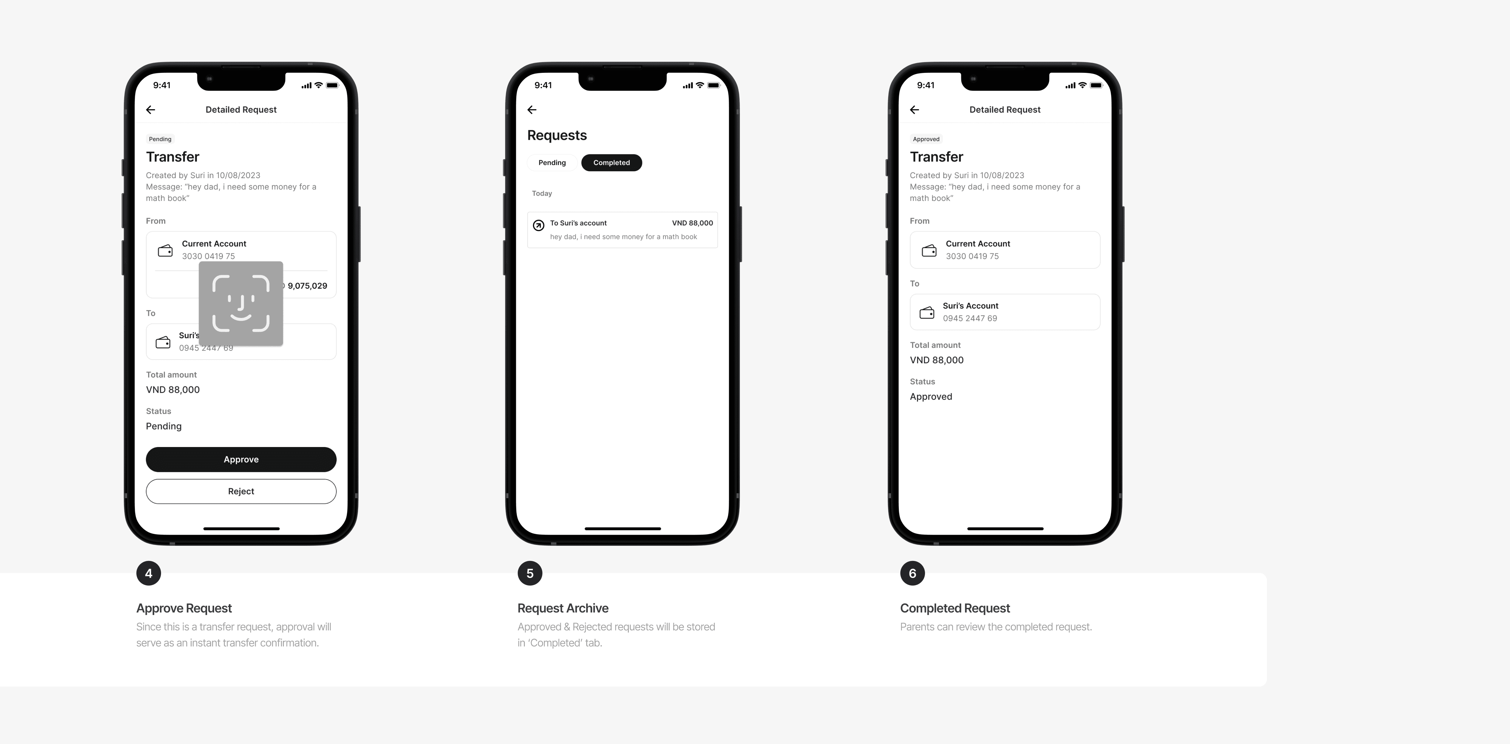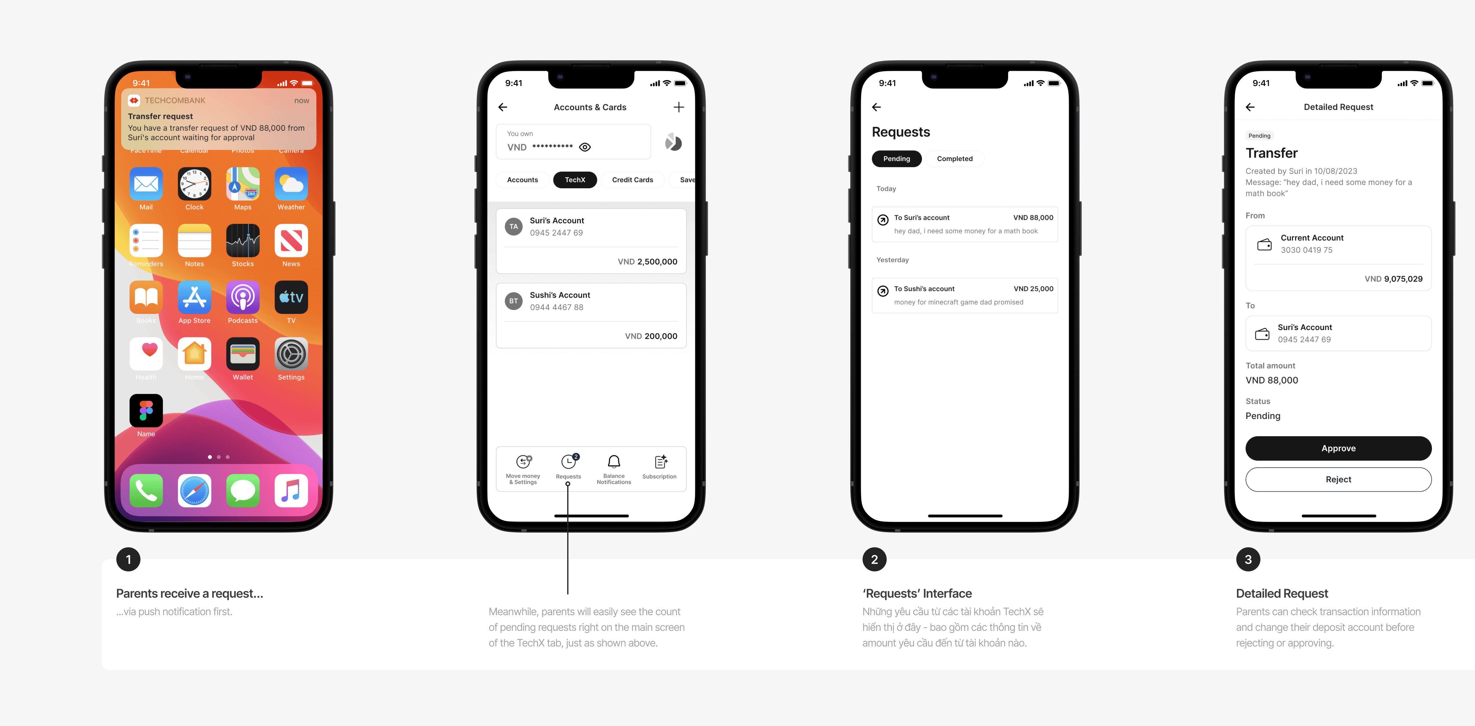When this happens, teens can use the "Request" feature on the TechX app to ask their parents for financial assistance. Parents can then review and either approve or reject the request using their Techcombank app.