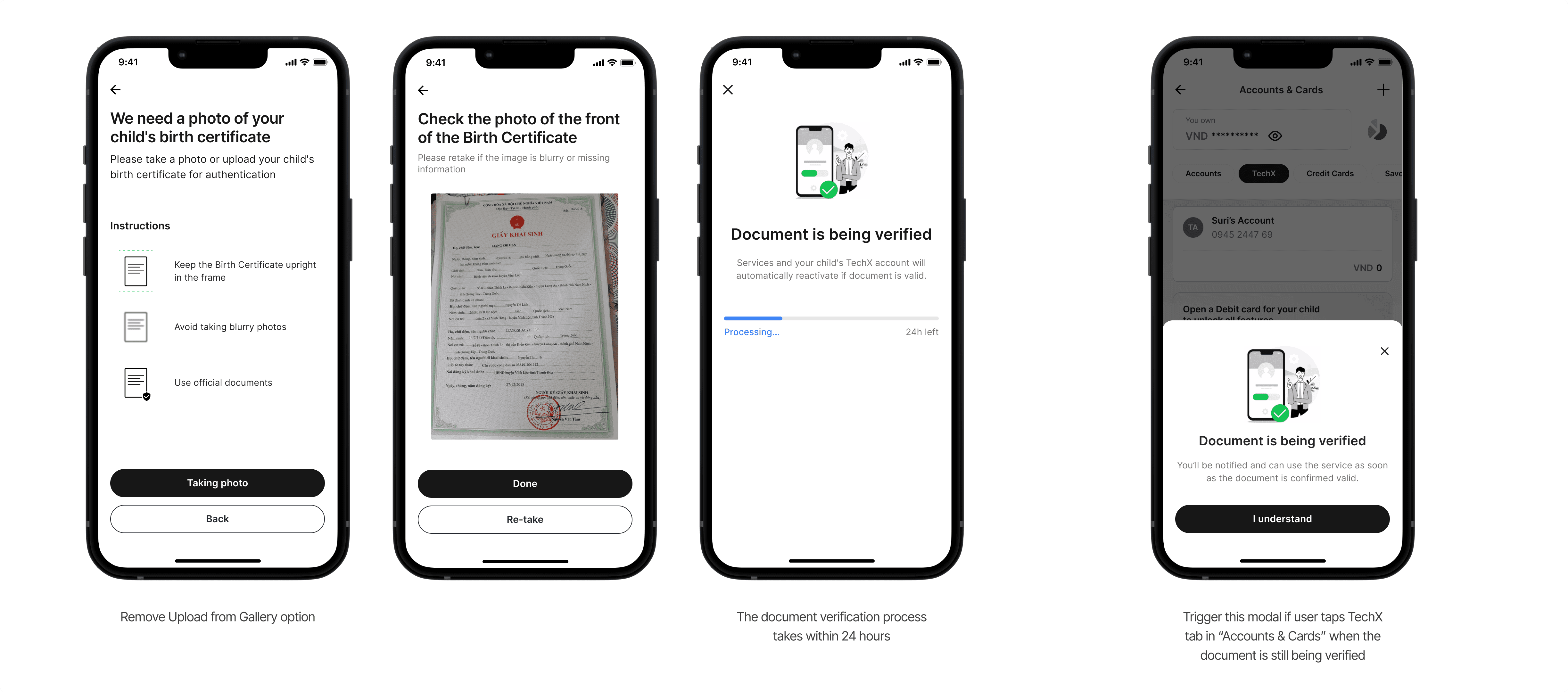 → The final decision only requires user to input child's full name (for temporary child's account name while the document is being verified). I called this new process 'OCR Flow' because from the view of user, it's like the way banks allow users (over 18 years old) to upload photos of their ID card instead of enter information manually when they open a bank account online.