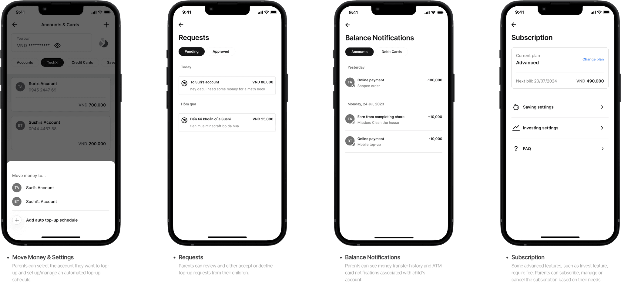 TechX is integrated in Techcombank so that parents can access to specific teen's account and control everything without having to download another app.