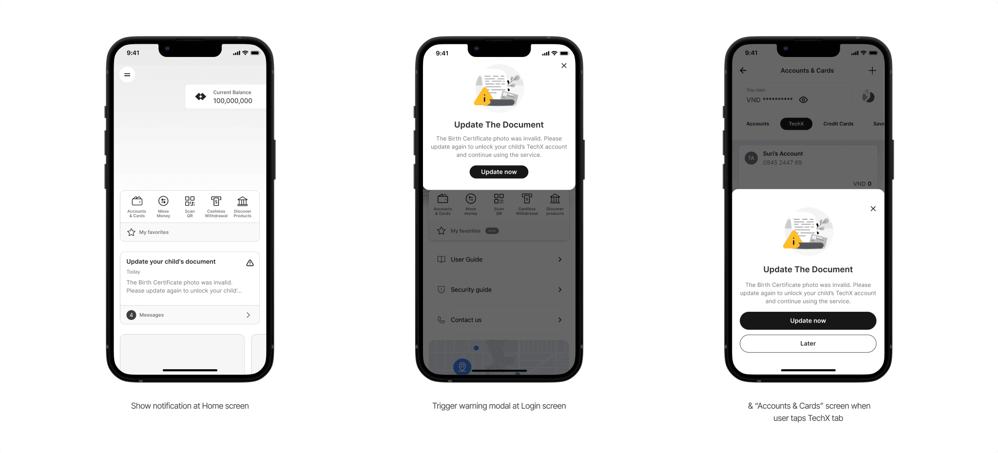 · Parents: ”Techcombank suspended the TechX service and disabled your child's account due to invalid registration document. Please update the document. Time limit: 30 days from notice”