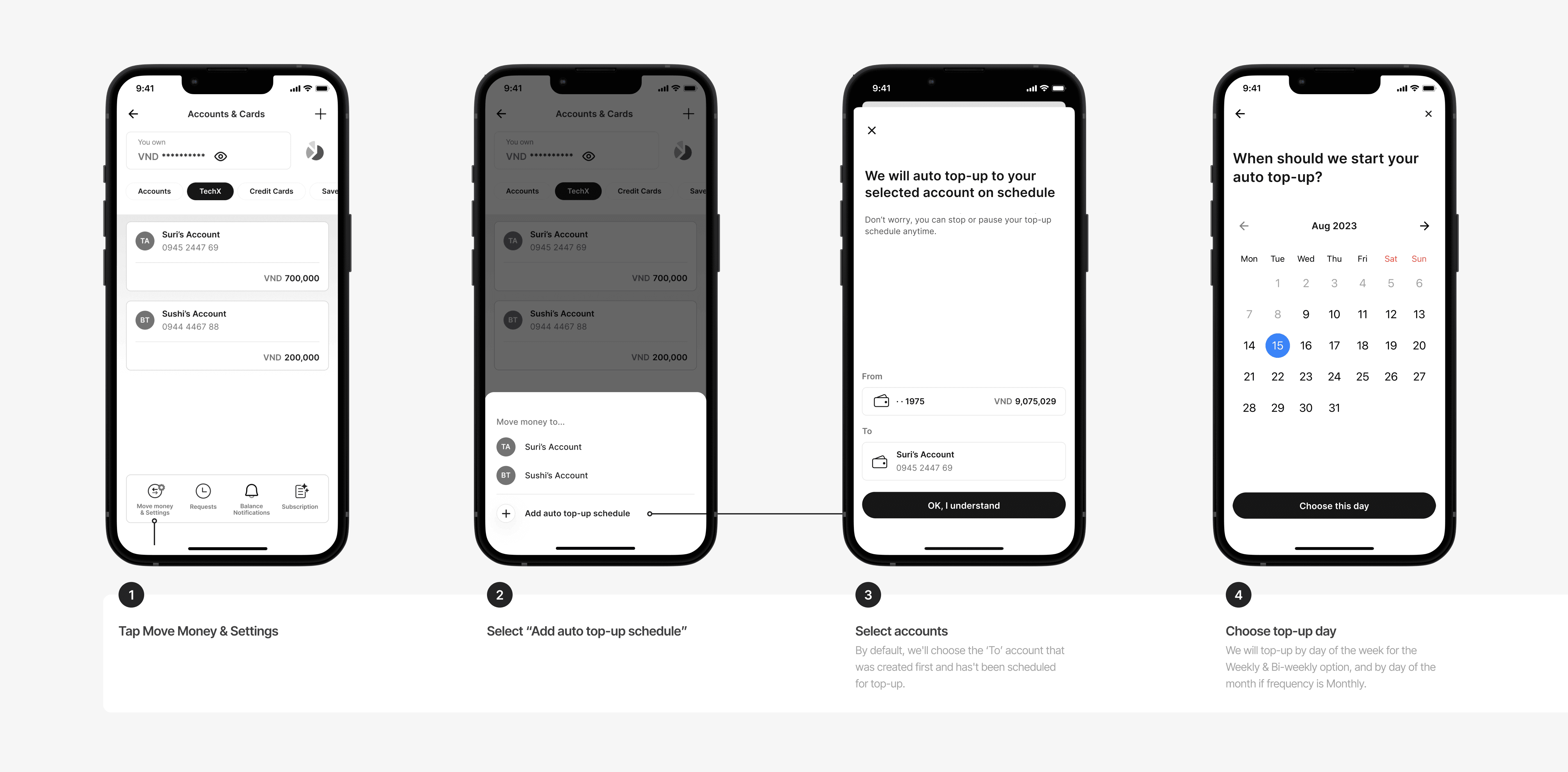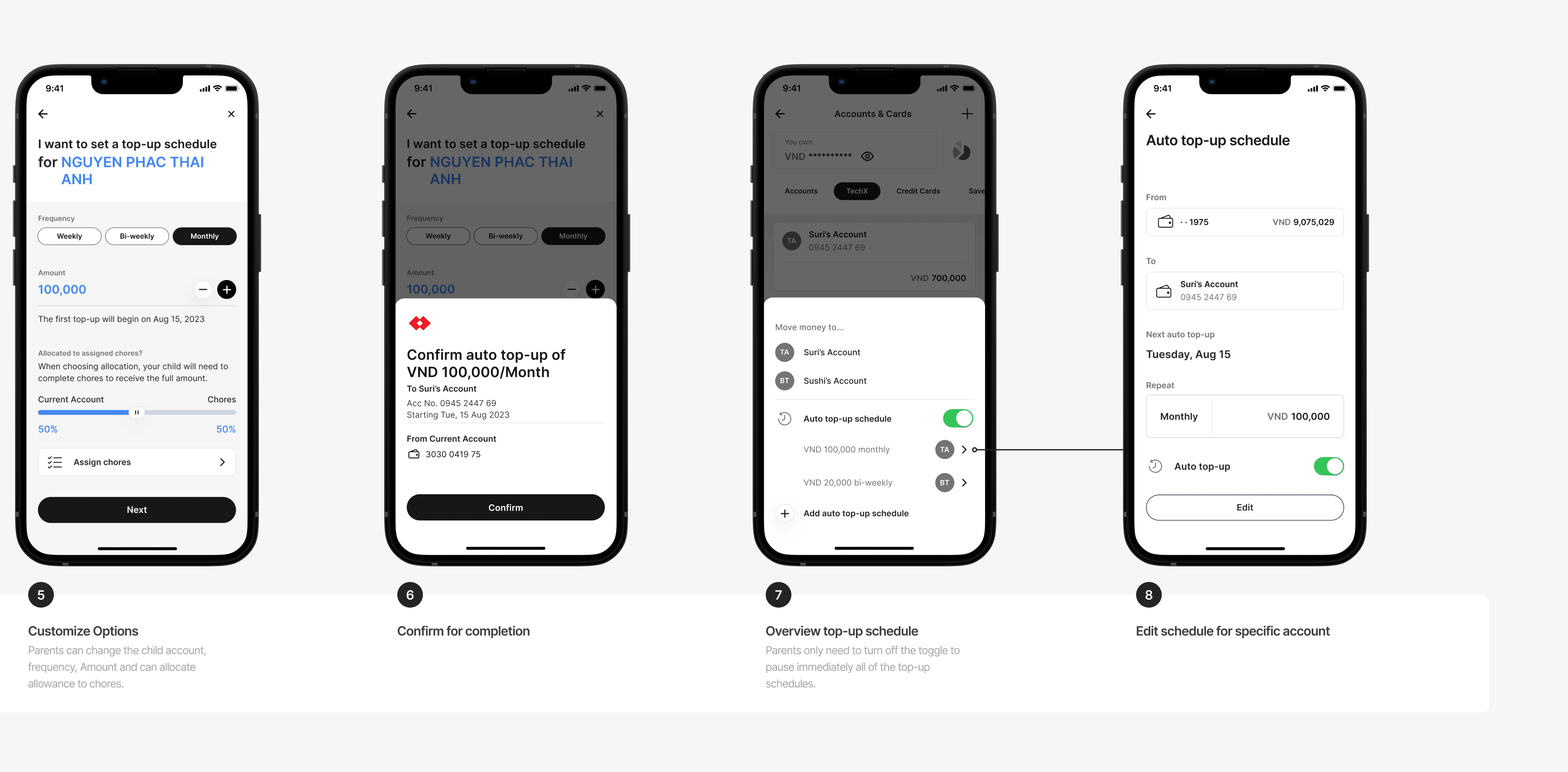 This section will first, show you the (1) prototype of how TechX service works on Techcombank - parents' app, and second, introduction of some (2) major flows.