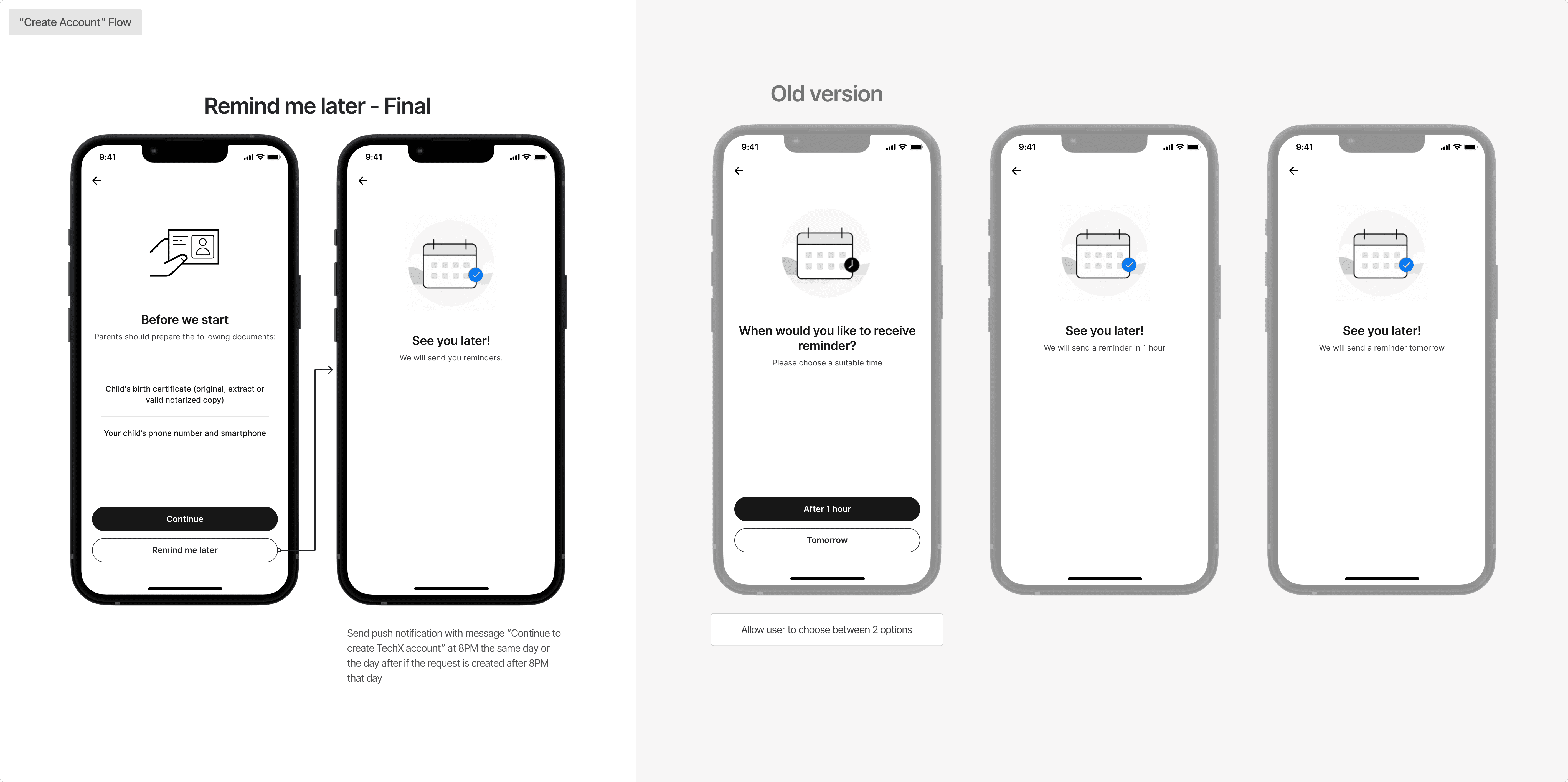 Instead of allowing user to choose when the reminder will be sent → Send push notification with message “Continue to create TechX account” at 8PM the same day or the day after if the request is created after 8PM that day.